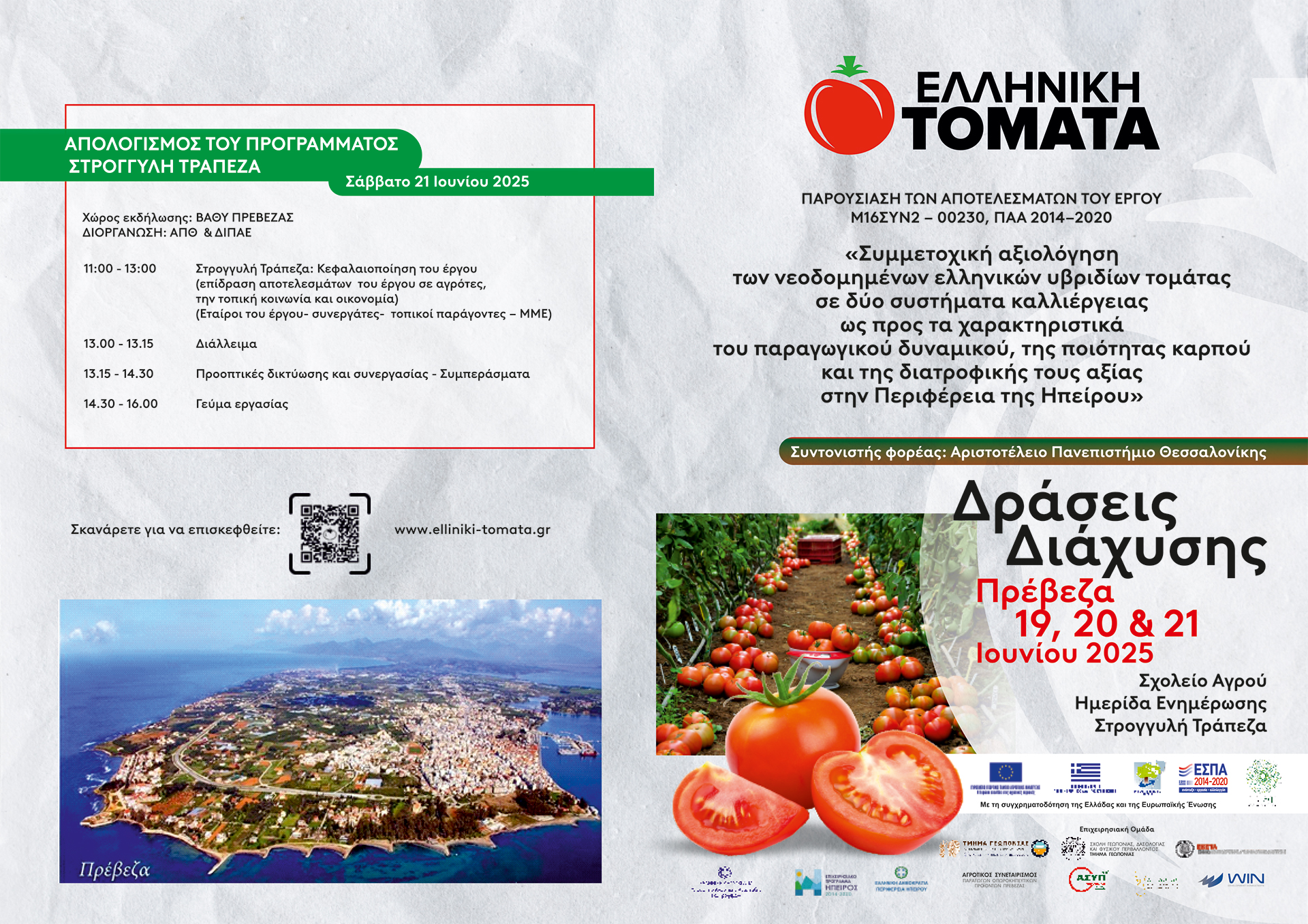 Το Εργο «Συμμετοχική αξιολόγηση των νεοδομημένων Ελληνικών υβριδίων τομάτας σε 2 συστήματα καλλιέργειας ως προς τα χαρακτηριστικά του παραγωγικού δυναμικού, της ποιότητας καρπού και της διατροφικής τους αξίας, στην Περιφέρεια της Ηπείρου», αποτελεί μια προσπάθεια αξιολόγησης των νεοδομημένων ελληνικών υβριδίων τομάτας στις συνθήκες της πόλης της Πρέβεζας με την σύμπραξη επιστημονικού φορέα και τοπικών αγροτικών συνεταιρισμών. Στόχος είναι ο Έλληνας παραγωγός να χρησιμοποιεί και ελληνικά υβρίδια τομάτας προσαρμοσμένα στο περιβάλλον και το σύστημα καλλιέργειας, υψηλής παραγωγικότητας και διατροφικής αξίας καρπού.